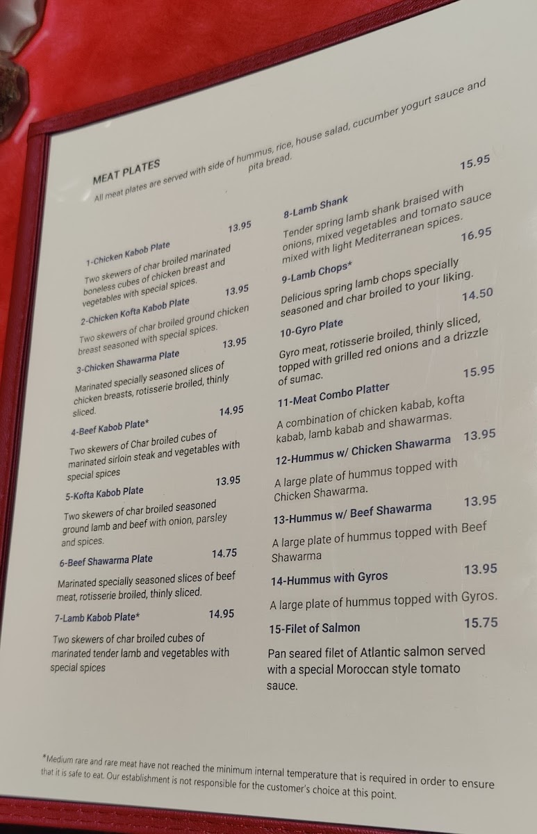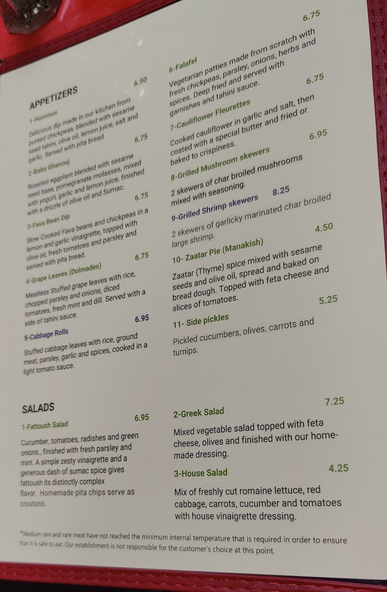 Guests can find classic options like falafel and shawarma, alongside fresh salads such as fattoush and house greens. Warm, hearty choices like lamb shank or kabob plates give a bit of heartiness for those looking to settle in. Sides like saffron rice or a basket of French fries complement the mains without overwhelming the palate.